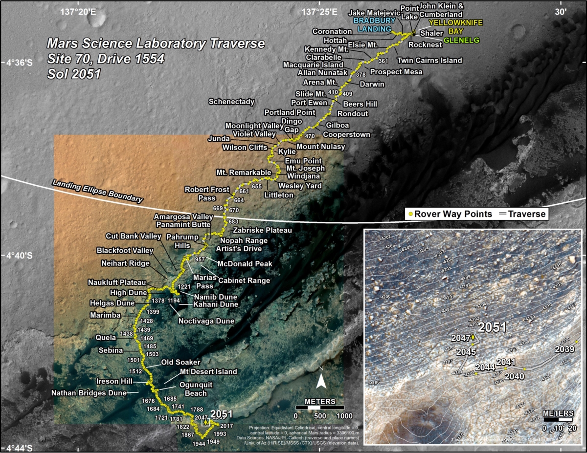 The map shows the route driven by Curiosity through the 2051 Martian day, or sol, of the rover’s mission on Mars (May 16, 2018).
