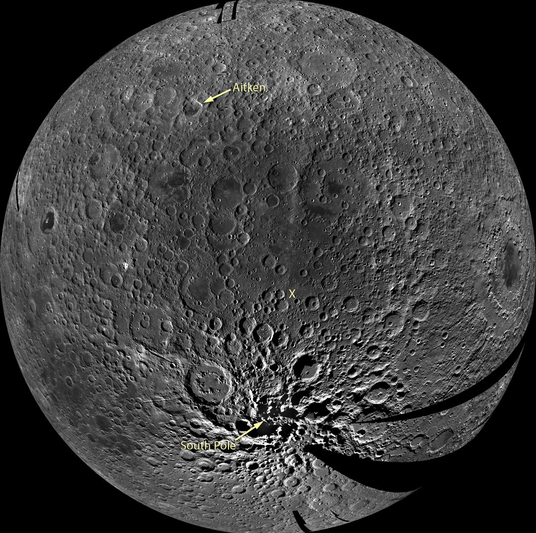 Aitken crater, located at 17 S, 173 E, anchors the northern rim of the South Pole-Aitken basin.