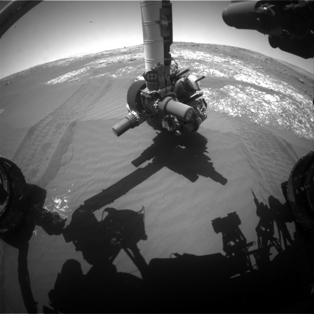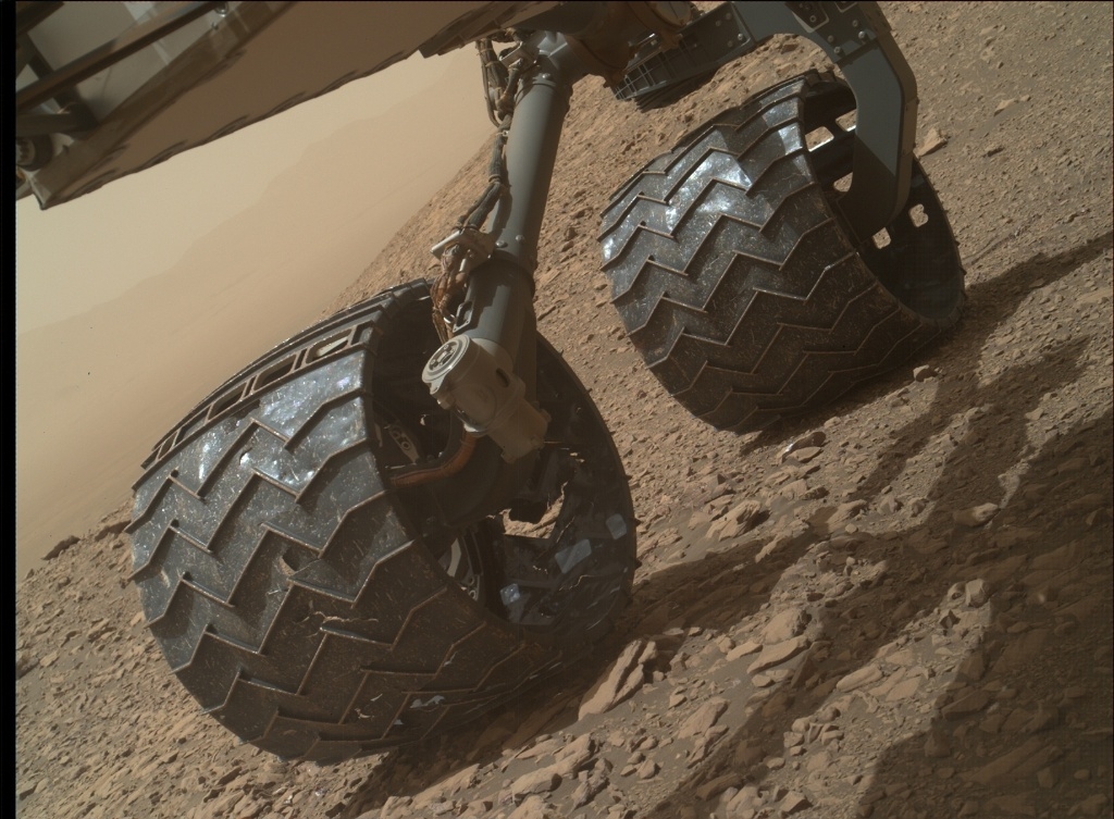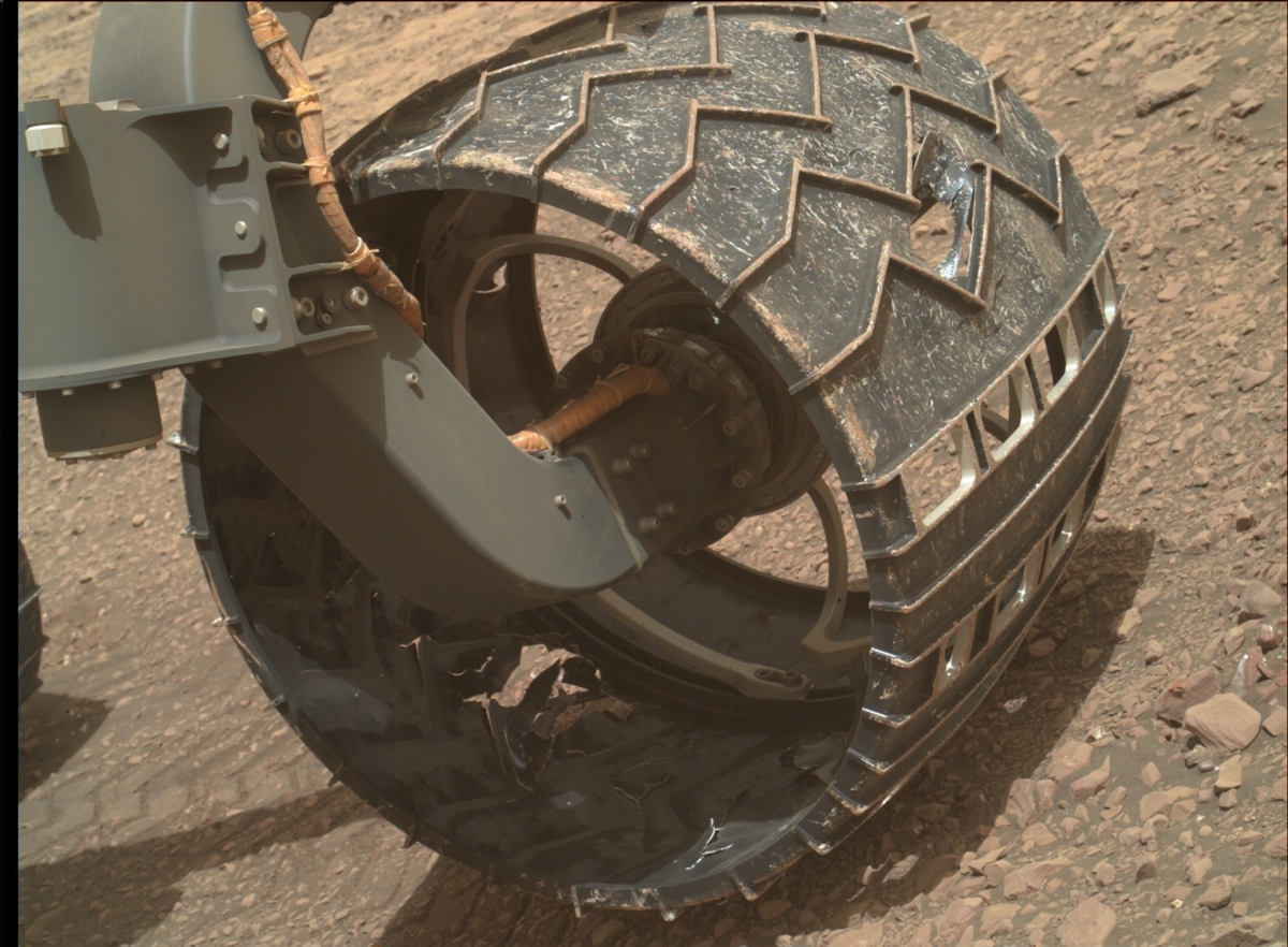 “We do this activity, dubbed Full MAHLI Wheel Imaging (or FMWI in NASA acronym speak), every few hundred meters to track damage to Curiosity’s wheels caused by the terrain. It’s important for us to take this observation in order to estimate how much farther the rover will be able to drive before the wheels become inoperable, and also to understand if the sharp edges of the broken wheels risk damaging the nearby cables,” Fraeman explains. “So far, we estimate we’re in pretty great shape for our plans to drive a lot farther up Mt. Sharp!”