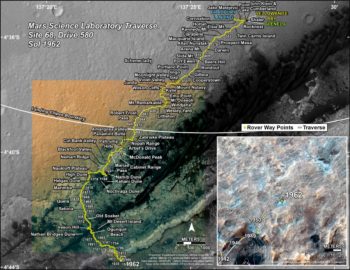 The map shows the route driven by NASA’s Mars rover Curiosity through the 1962 Martian day, or sol, of the rover’s mission on Mars (February 12, 2018).