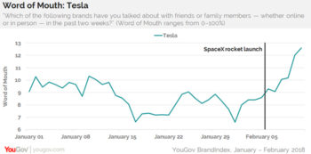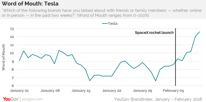 According to London-based YouGov BrandIndex, Tesla’s Word of Mouth score started rising several days before the huge booster’s liftoff, when 7 percent of Americans aged 18 and over said they spoke about the car brand with family or friends in the past two weeks.