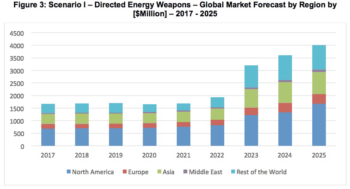 The estimate is that the global directed energy weapons market will be valued at about $1.67 billion in 2017, growing to more than $4 billion in 2025.