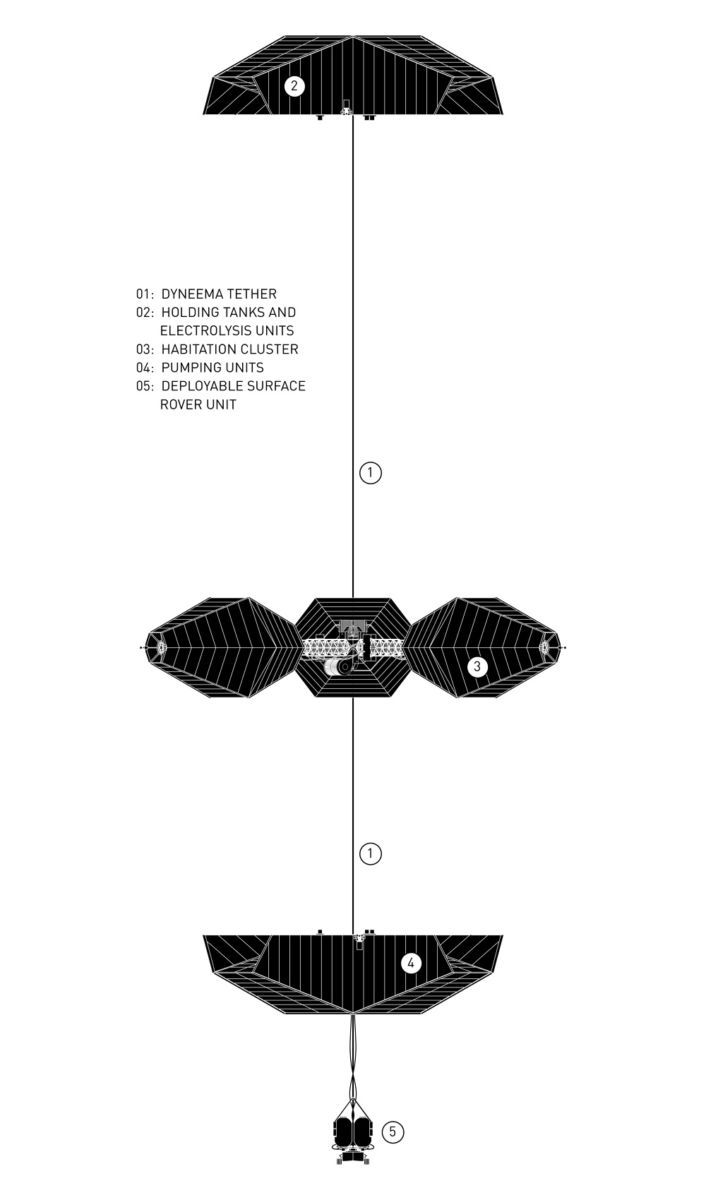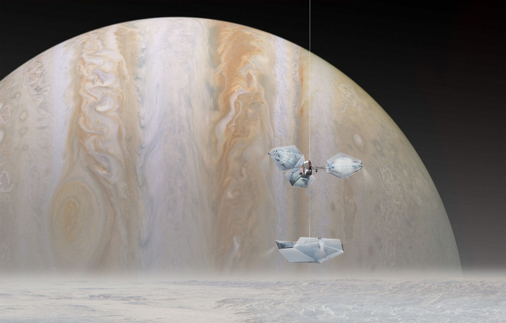 “The tethered expansion of the units allows for slow and steady analysis of atmospheric conditions on the way down to the surface. At its extreme limit the explorer module is able to touch down on the surface and take samples or harvest water ice,” they explain.
