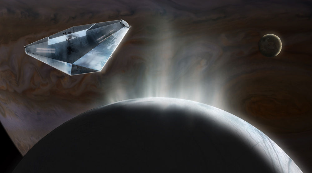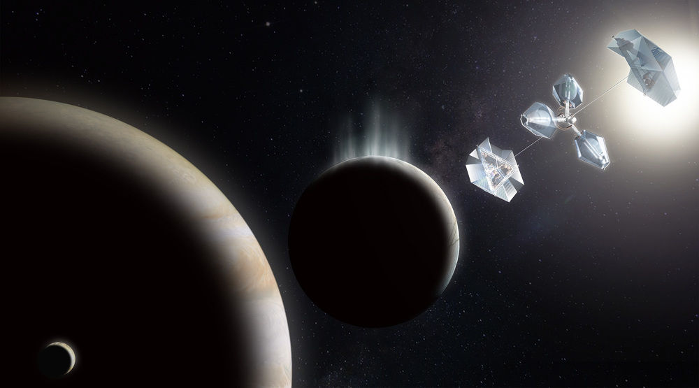 “The concept consists of three pressure vessels surrounded by transparent and translucent water ice for radiation shielding and views out. When the vehicle reaches a target moon it would stop spinning and park in an L1 spot (stable Lagrange Point),” the researchers note.