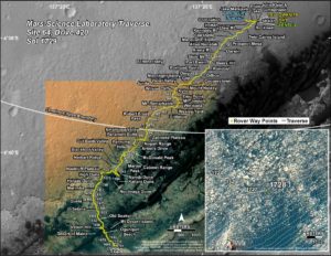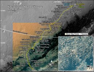 The map shows the route driven by NASA’s Mars rover Curiosity through the 1732 Martian day, or sol, of the rover’s mission on Mars (June 21, 2017).