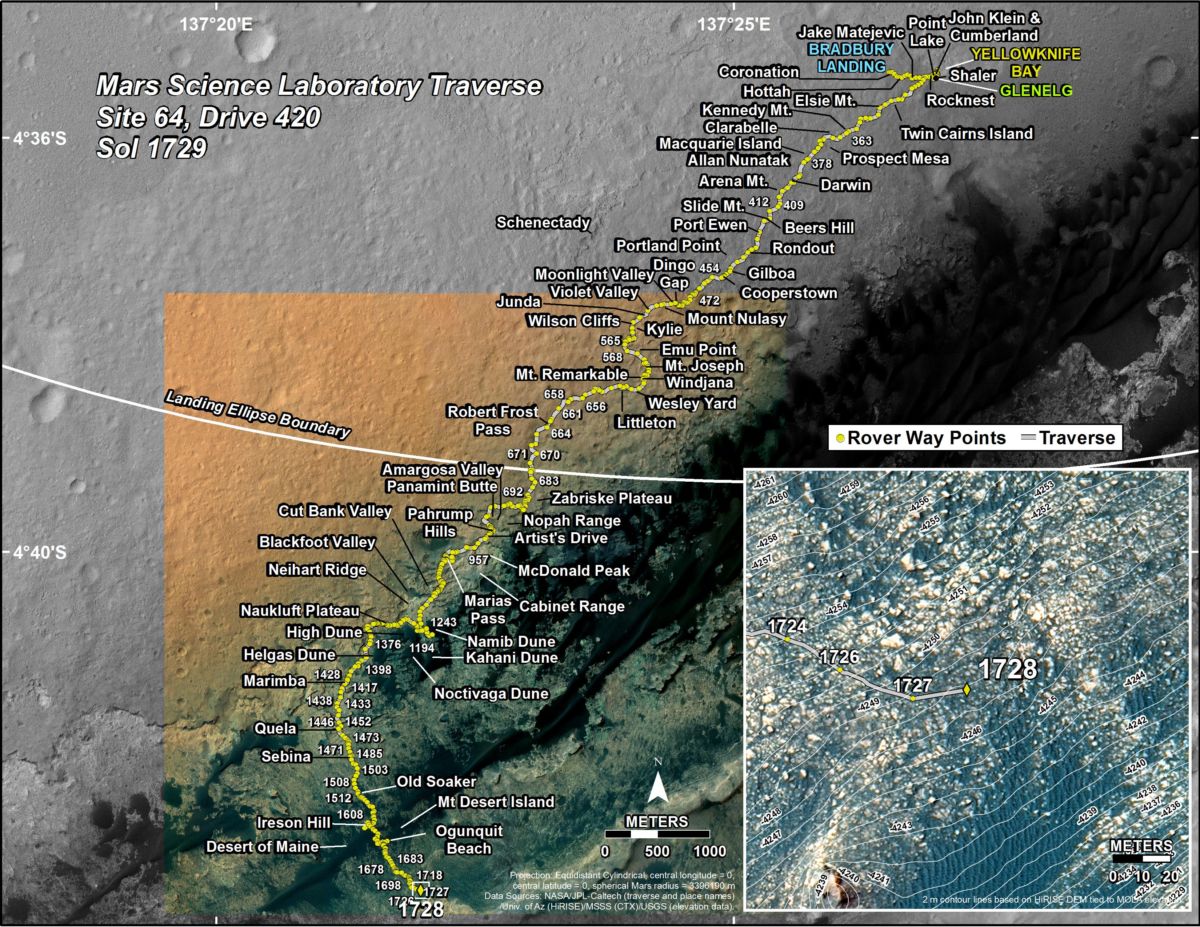 Meanwhile, the Jet Propulsion Laboratory has issued a Curiosity traverse map through Sol 1732.