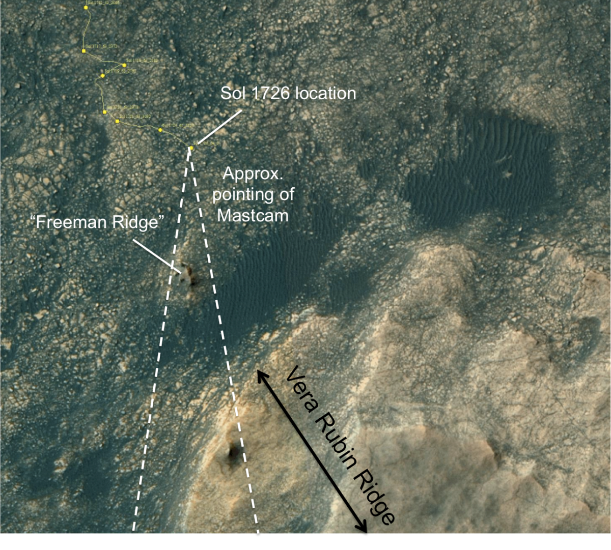 “Curiosity continues to drive to the east-northeast around two small patches of dunes that are positioned just north of Vera Rubin Ridge,” Salvatore adds. “Once beyond this easternmost dune patch, the plan is for her to turn to the southeast and towards the location identified as the safest place for Curiosity to ascend the ridge.”