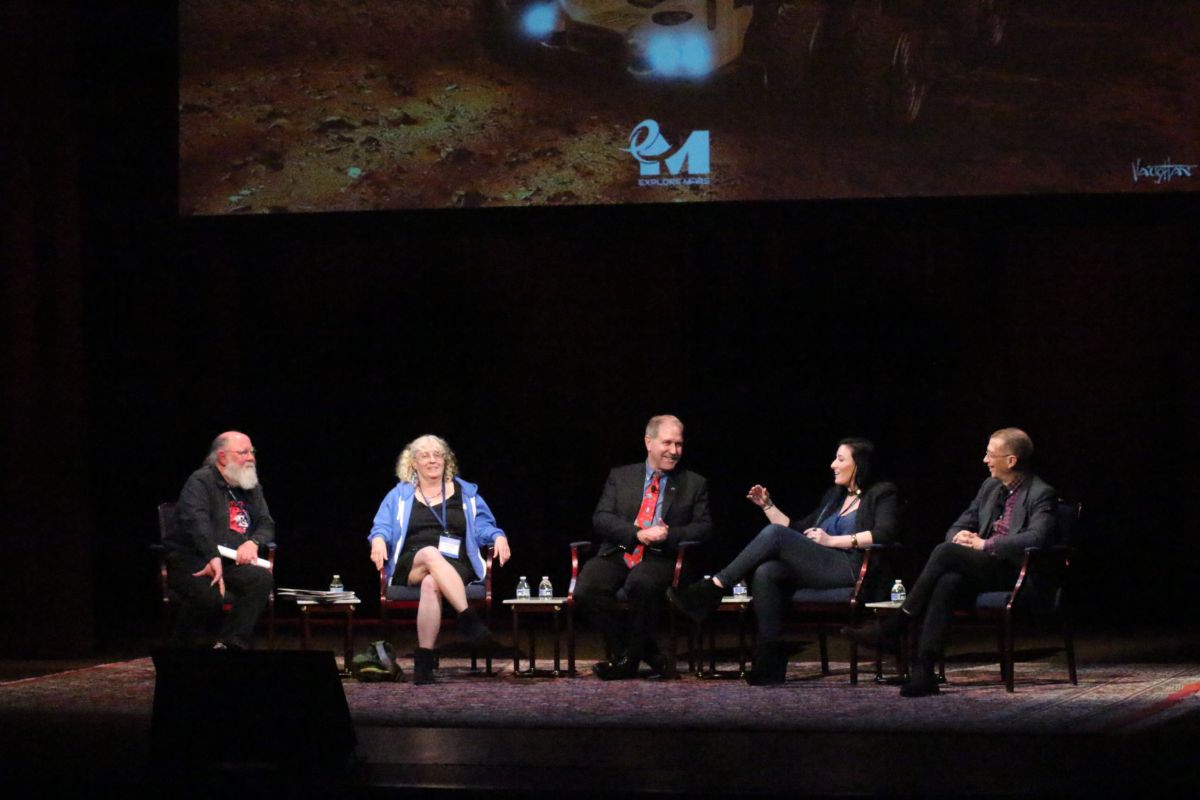 Humans to Mars panel session on risk and space exploration featuring, left to right: Leonard David (moderator); astrobiologist Penny Boston; former astronaut John Grunsfeld; Tiffany Montague (former Manager, Google Space Projects; and Richard “Rick” Davis (NASA, Science Mission Directorate, Assistant Director).
