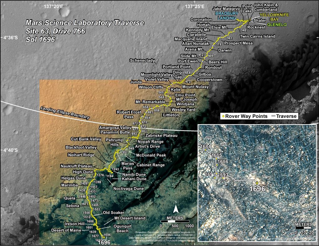 This map shows the route driven by NASA’s Mars rover Curiosity through the 1696 Martian day, or sol, of the rover’s mission on Mars (May 14, 2017).