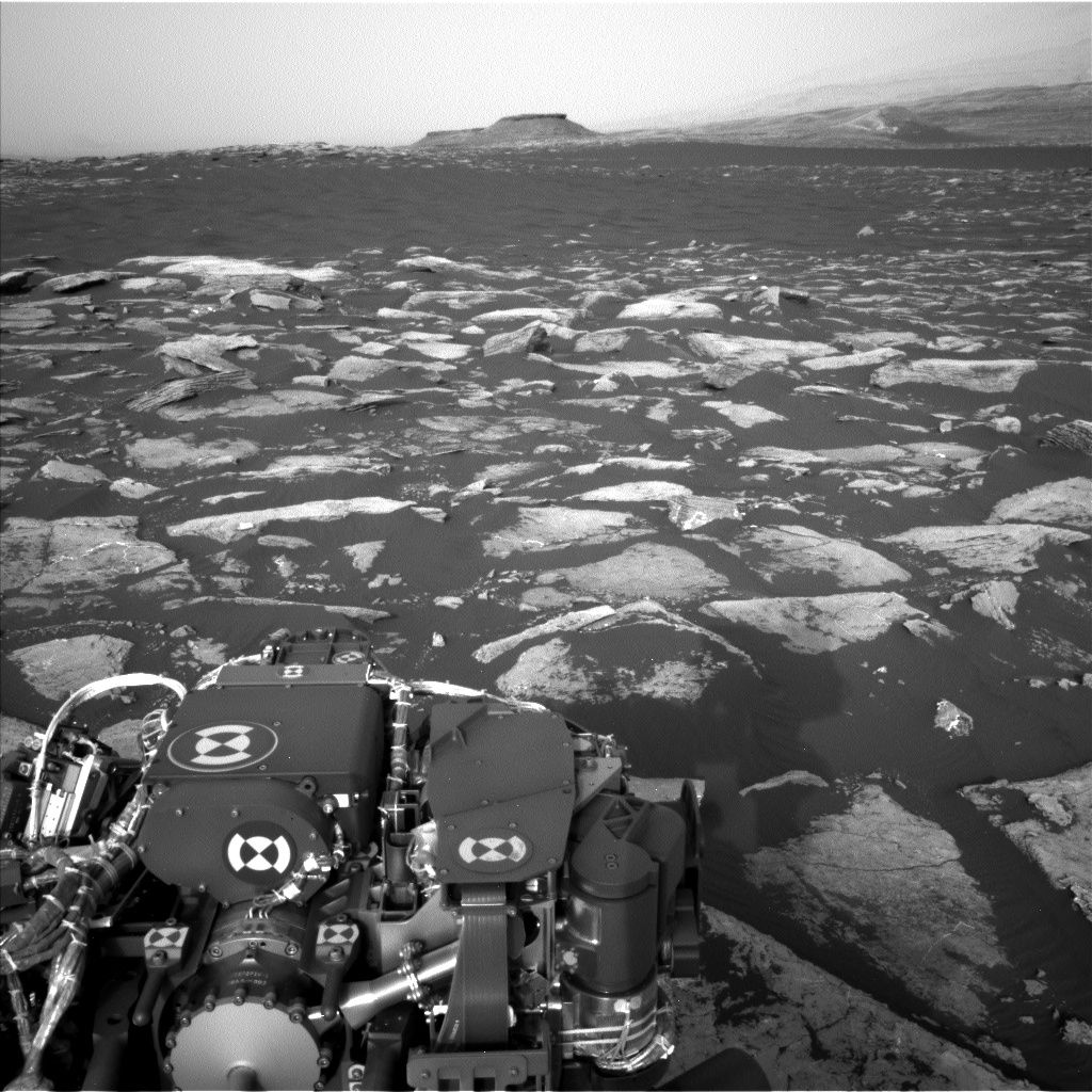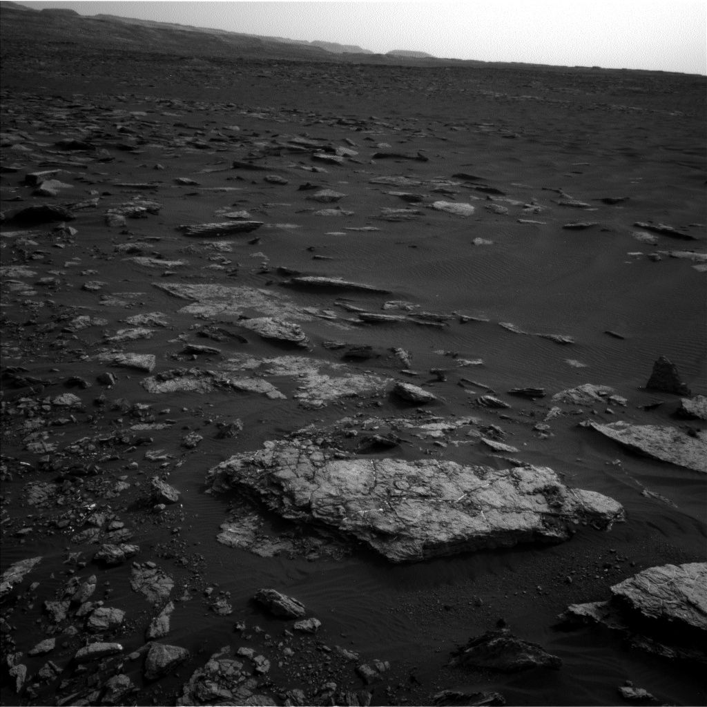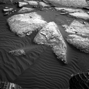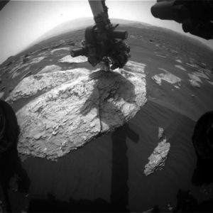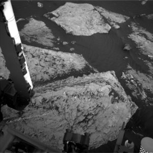 This bedrock is too close to the rover to allow Chemistry & Camera (ChemCam) data to be safely acquired, so a nearby exposure was selected for an analogous measurement and named “Hurricane Mountain.”