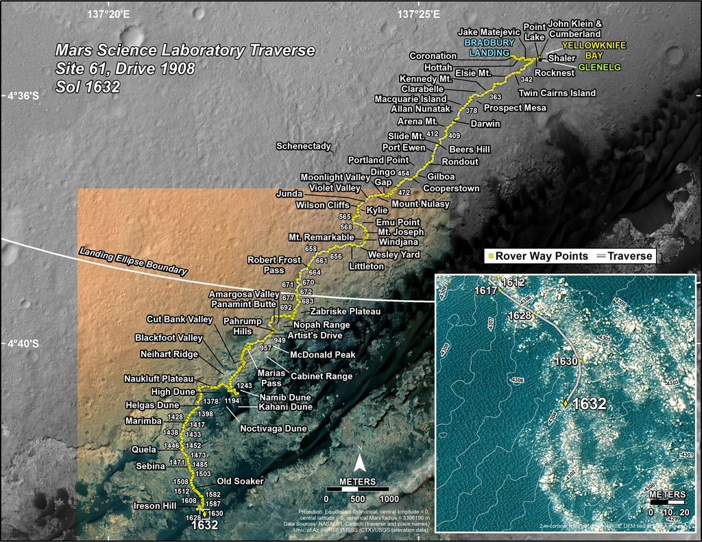 This map shows the route driven by NASA’s Mars rover Curiosity through the 1632 Martian day, or sol, of the rover’s mission on Mars as of March 10, 2017.