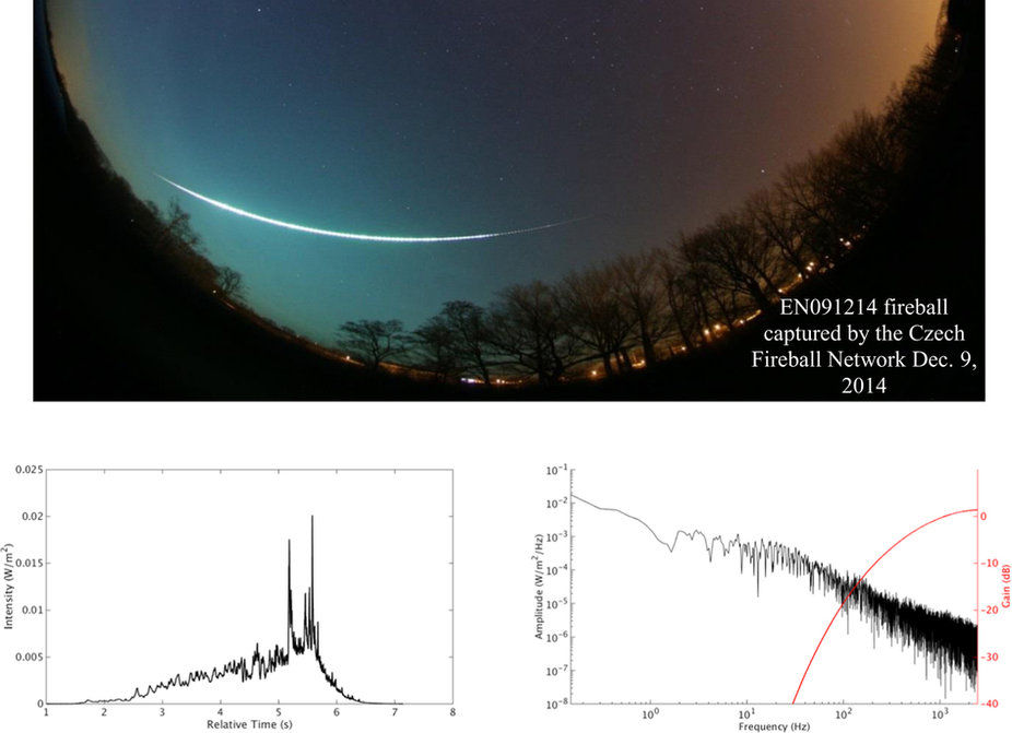Open-shutter photograph of fireball EN09121418 taken by Pavel Spurný at the Czech Fireball Network along with related data regarding sound emitted from fireballs.