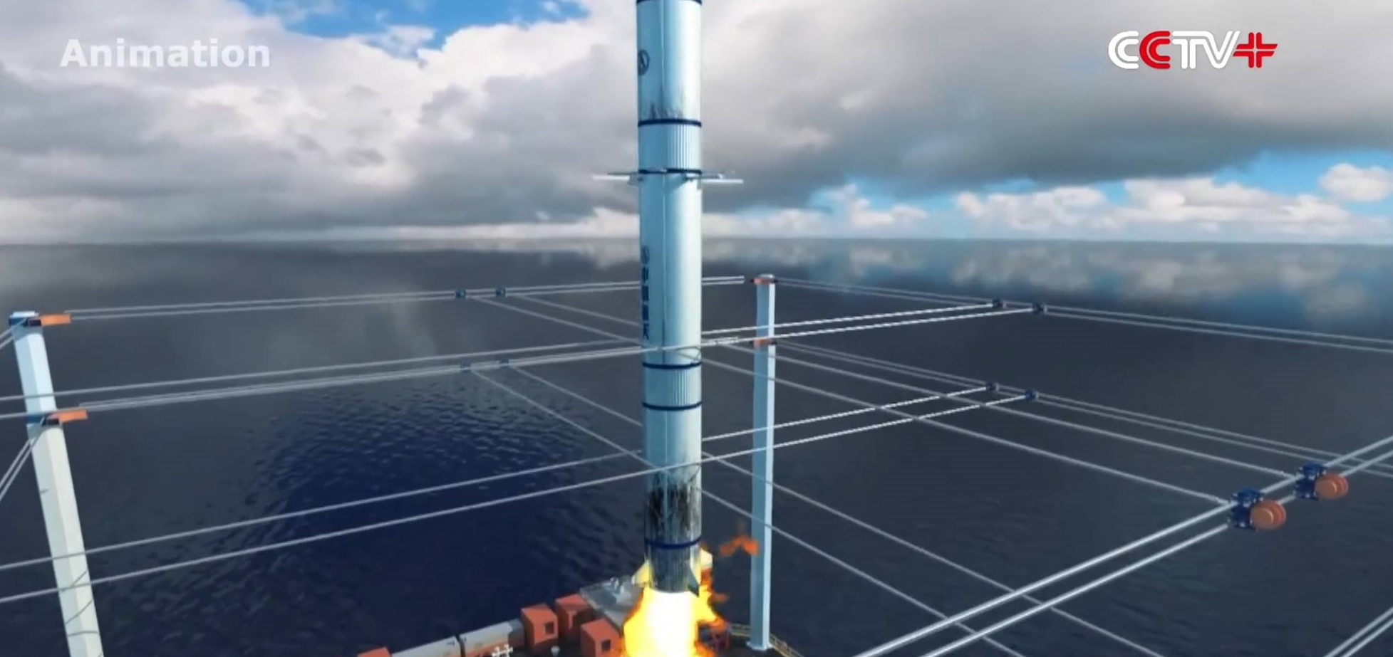 Shades of SpaceX. China Long March-10 stage heads for ocean landing in this artwork.
