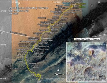 A newly released map shows the route driven by NASA’s Mars rover Curiosity through the 2691 Martian day, or sol, of the rover’s mission on Mars (March 2, 2020).
