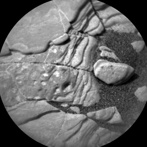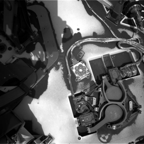 After the robot’s successful drilling of “Mary Anning 3,” bits of rock powder are waiting in the drill assembly for delivery to the robot’s Sample Analysis at Mars (SAM) Instrument Suite. A recently scripted plan has Curiosity extending its arm over the SAM inlets (the paddle shaped doors) and then rotate the drill backwards so that six portions of powdered rock are dropped off.