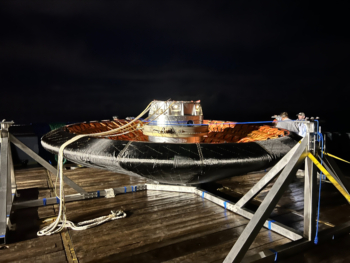 Also retrieved from the Pacific Ocean, LOFTID’s ejectable data that holds a backup copy of the data recorded during the heat shield’s plunge through Earth’s atmosphere. Another copy of the data is stored aboard the heat shield itself.