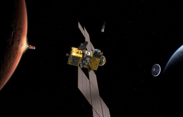 Artist’s impression of the elements required for a Mars Sample Return mission including the NASA’s Mars Ascent Vehicle (MAV), the European Space Agency’s Earth Return Orbiter, the Mars sample canister and the Earth entry capsule.