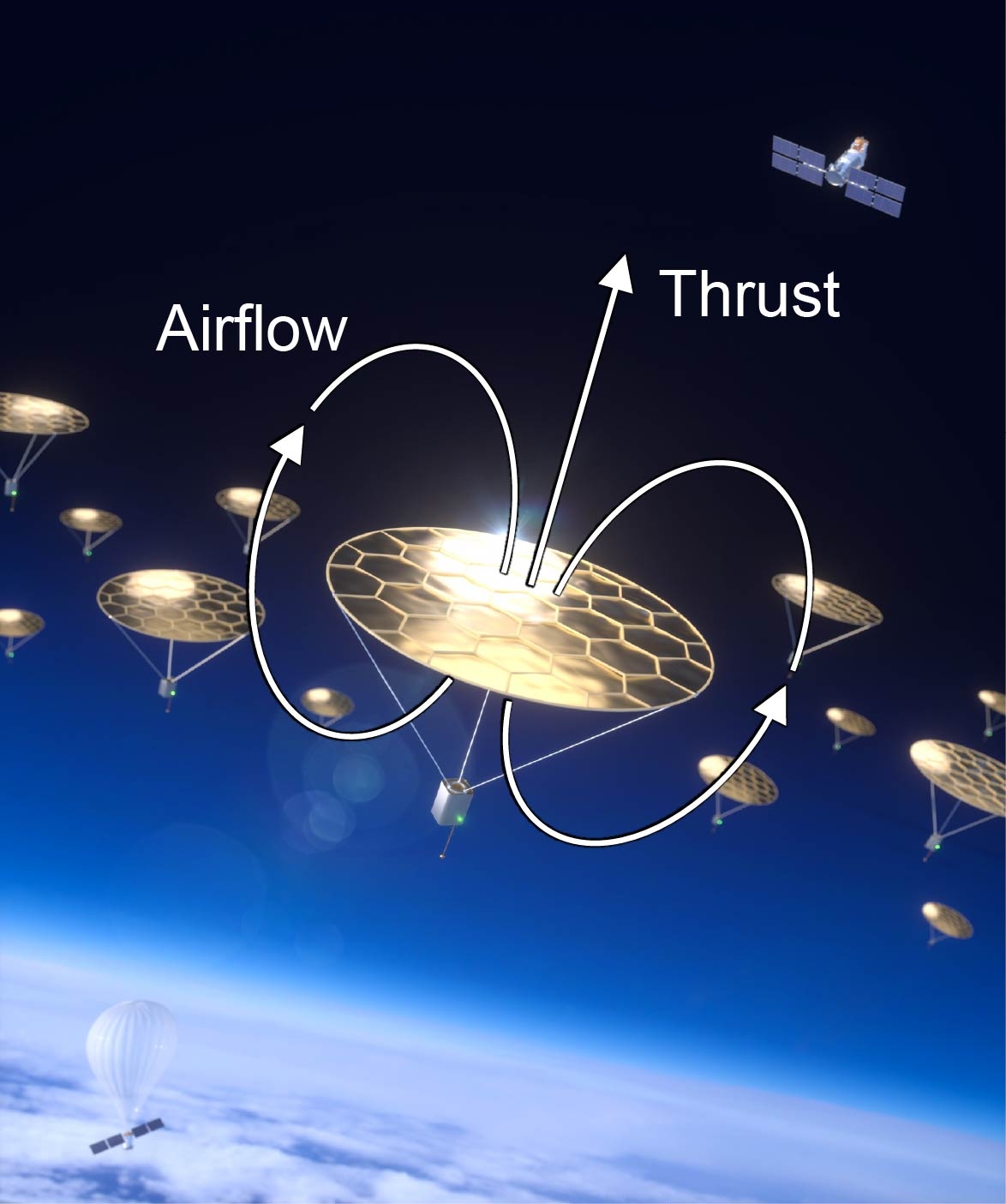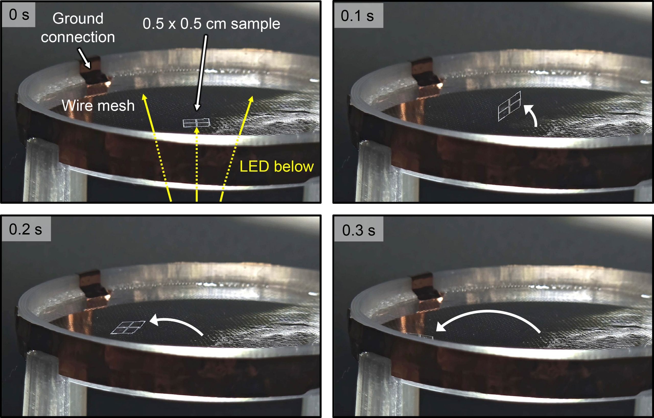 Time-lapse photos of a micro-structure flying when illuminated. Proof-of-concept experiments support use of such devices to fly in the uncharted mesosphere using photophoresis.