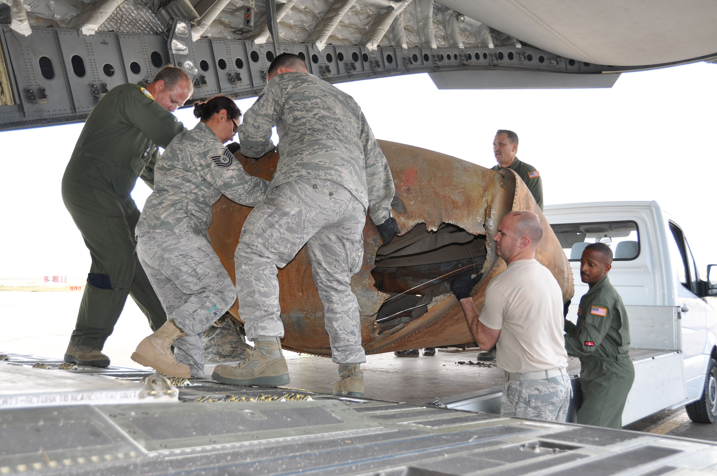 Air Force reservists load recovered rocket parts in a 2011 trip to Mongolia. The debris was identified as expended hardware from an Air Force booster that circled Earth for nearly a decade.