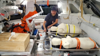 DLR radiation biologist, Thomas Berger with the dummies in the Orion capsule during a “fit check” of Helga and Zohar.