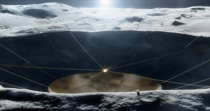 This proposal centered on deploying a wire mesh using wall-climbing robots in a 3 to 5 kilometer diameter crater, with a suitable depth-to-diameter ratio, to form a parabolic reflector with a one kilometer diameter.