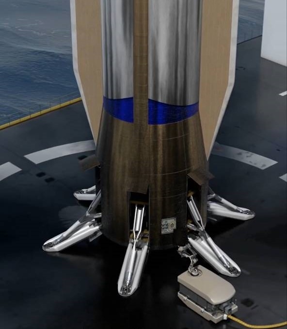 The NG-2 first stage aft module houses six hydraulically-actuated legs to support and secure the first stage during landing on the platform. Post-landing, use of mobile robotic hardware will safe the first stage.