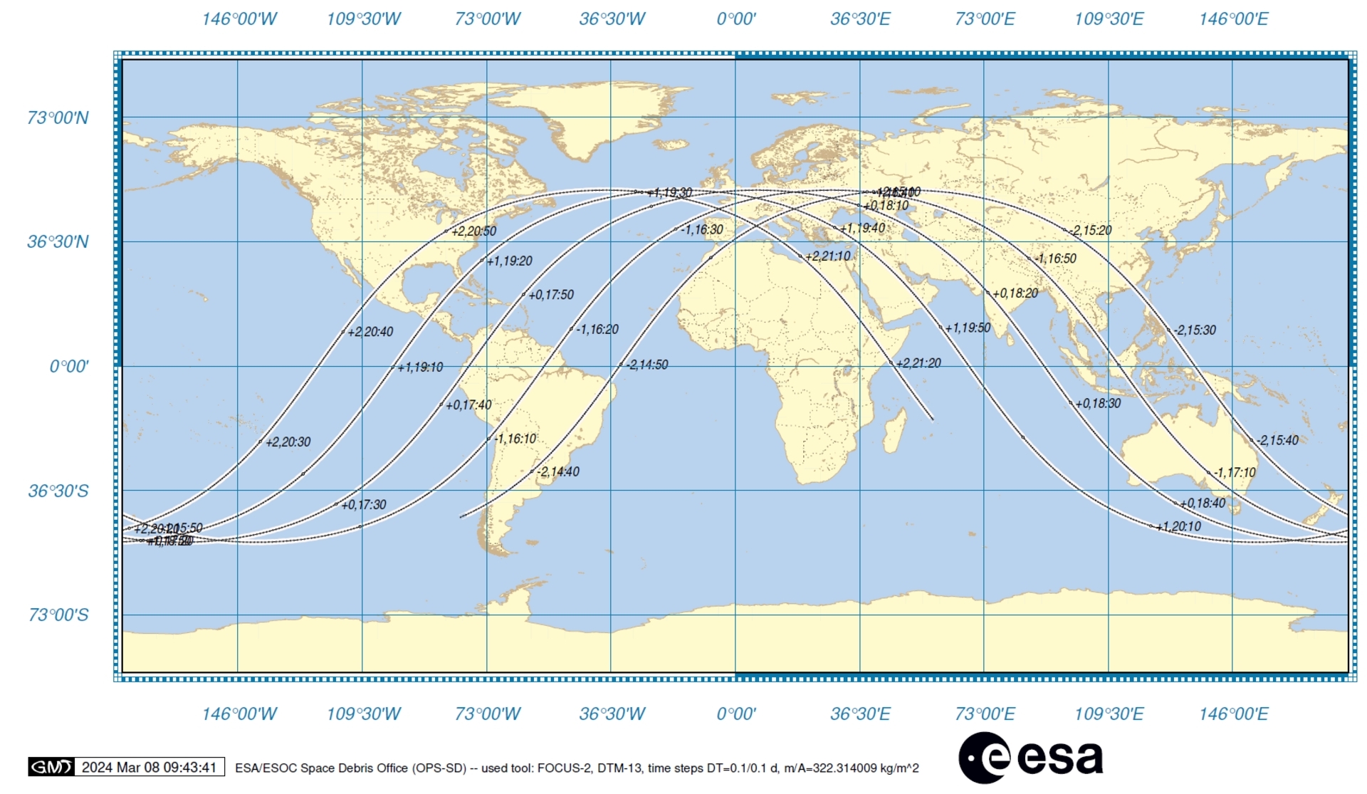 Chart shows ground track of a set of used Nickel-Hydrogen batteries jettisoned from the International Space Station in 2021. Chart indicates situation as of March 8, and forecasts a reentry between approximately 15:35 CET and 22:25 CET on Friday March 8. The reentry zone effectively stretches from -51.6deg south to 51.6deg north.