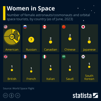 “A significant gap exists between the number of male and female astronauts/cosmonauts. A total of 325 men from the U.S. had become astronauts or orbital space tourists as of June 16, 2023,” reports Statista’s Anna Fleck. “The next highest numbers were 121 Russian men, 16 Chinese men, 14 Japanese men and 11 Canadian men.”